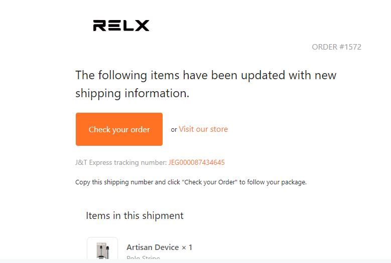 In the event that you haven't received the shipping update email, please contact our customer service team:support.ar@relxintl.com